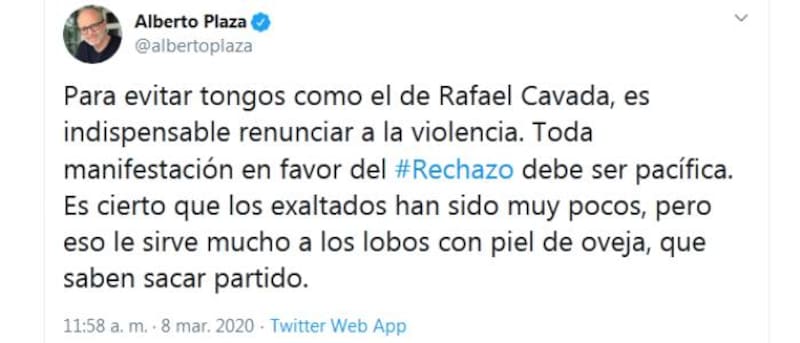 "Para evitar tongos como el de Rafael Cavada, es indispensable renunciar a la violencia. Toda manifestación en favor del #Rechazo debe ser pacífica", escribió de entrada en un tuit.