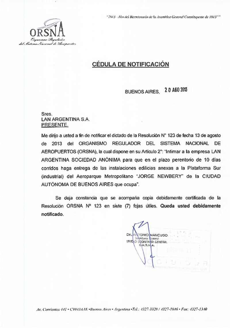 El director de asuntos corporativos de LAN Argentina, Agustín Agraz, informó al portal Infobae que la empresa recibió una notificación del Organismo Regulador del Sistema Nacional de Aeropuertos (ORSNA) en la que se da por extinguido el contrato de arrendamiento que vence en el año 2023 e intimó a la empresa a desalojar su hangar del aeroparque en el plazo de diez días.