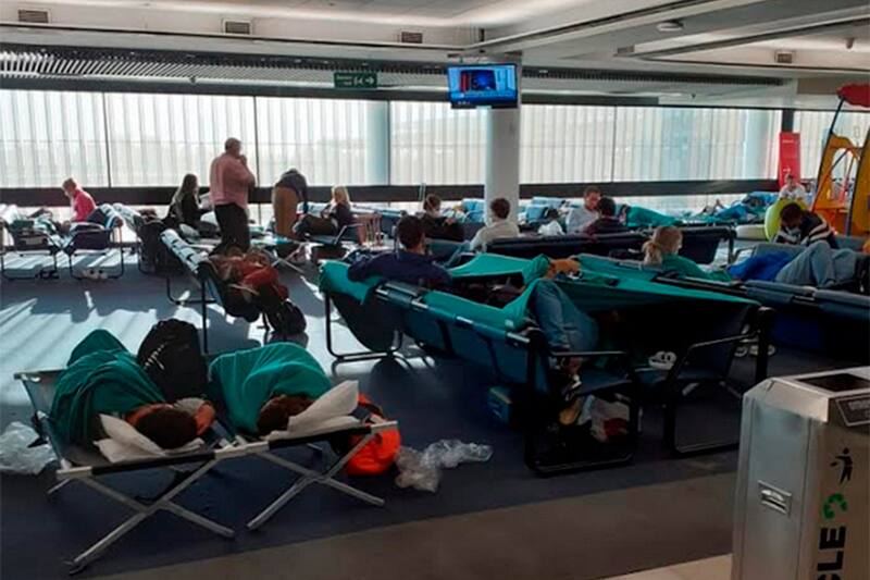 "Dos noches tenemos que pasar aquí, el domingo reprogramaron cinco veces el vuelo. Hay filas de siete u ocho horas. Estamos hacinados acá, todas las salas de embarque están llenas. Hay gente de Argentina, Colombia, Canadá, España y Australia", dijo angustiada Vale.