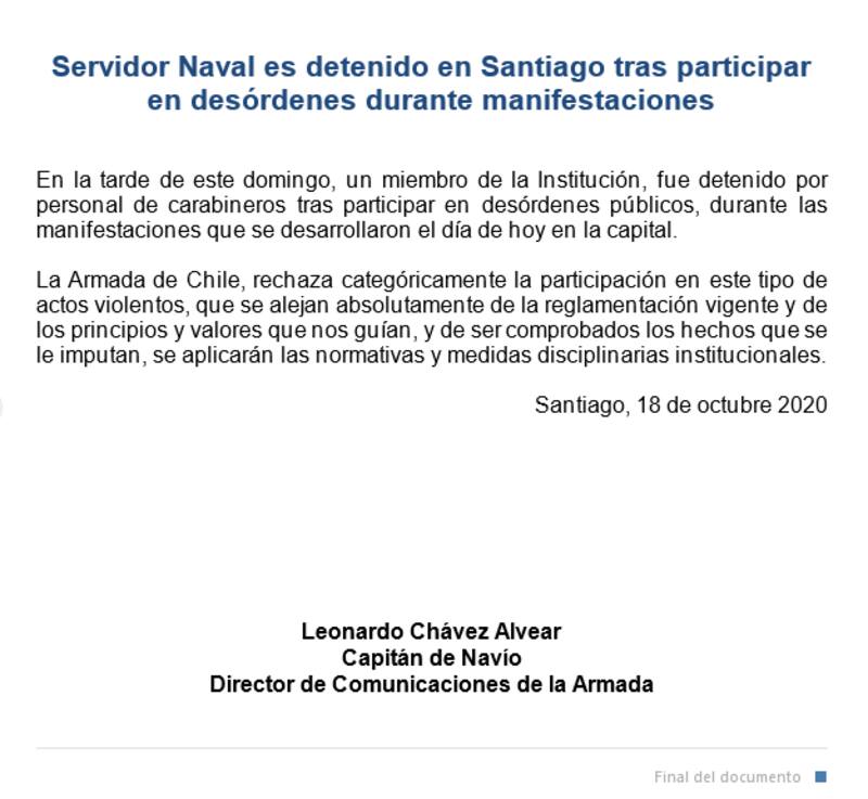 "En la tarde de este domingo, un miembro de la Institución, fue detenido por personal de carabineros tras participar en desórdenes públicos, durante las manifestaciones que se desarrollaron el día de hoy en la capital", comenzó el escrito.