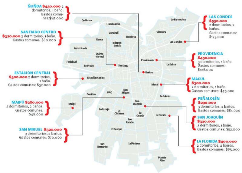 Entre ellas, la opción más económica es Maipú, con inmuebles de $280.000 mensuales. Los arriendos más caros se encuentran en Las Condes, en la que un departamento con 2 dormitorios y 2 baños puede costar hasta $550.000.