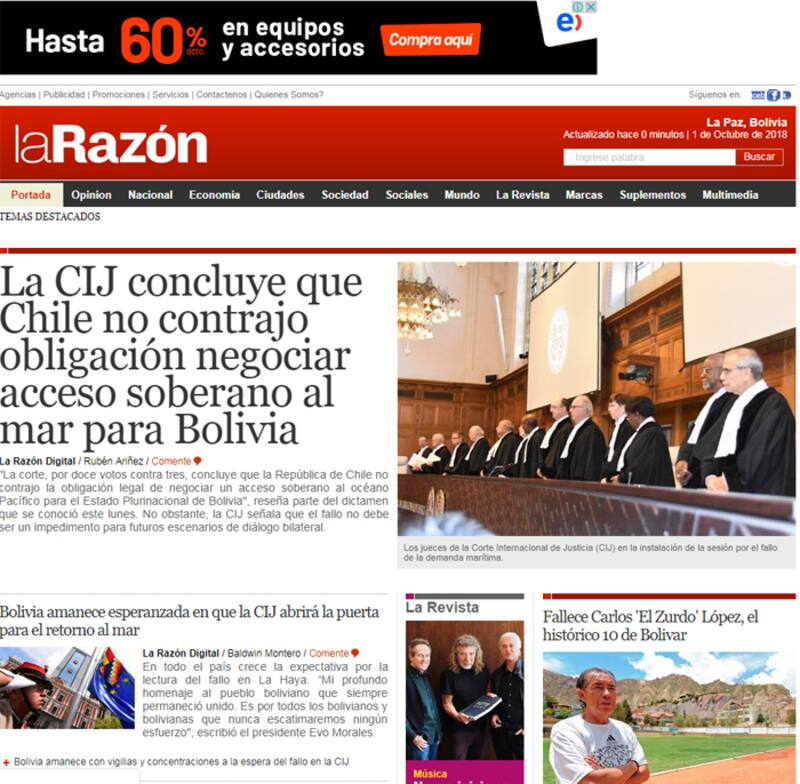 Con sobrios titulares los medios con versión digital dieron a conocer la determinación adoptada los los jueces. La excepción fue el diario Cambio, que obvió la derrota de su país y tituló "CIJ: Chile y Bolivia deben dialogar".