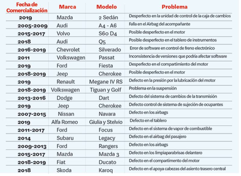 Cabe considerar que las alertas de seguridad no discriminan la gama del auto y, tal como se puede ver en el recuadro, existen problemas en automóviles de todas las marcas y en años que varían entre los vendidos en 2007 y 2019.