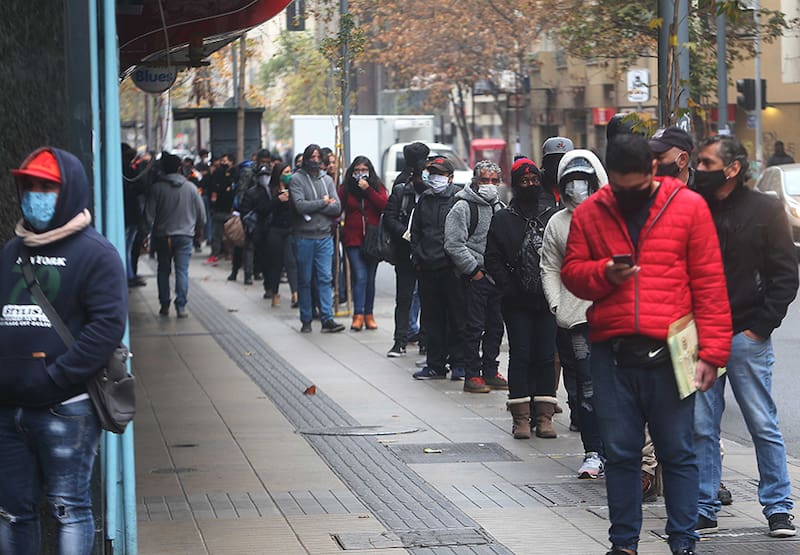 Pese a que ayer superamos los 90 mil contagios por coronavirus y a la cuarentena total que rige en La Región Metropolitana, igual se aprecia mucho movimiento en la calle. Entre las postales que más llaman la atención están las largas filas en entidades bancarias o en las sucursales de la Administradora de Fondos de Cesantía de Chile (AFC Chile).