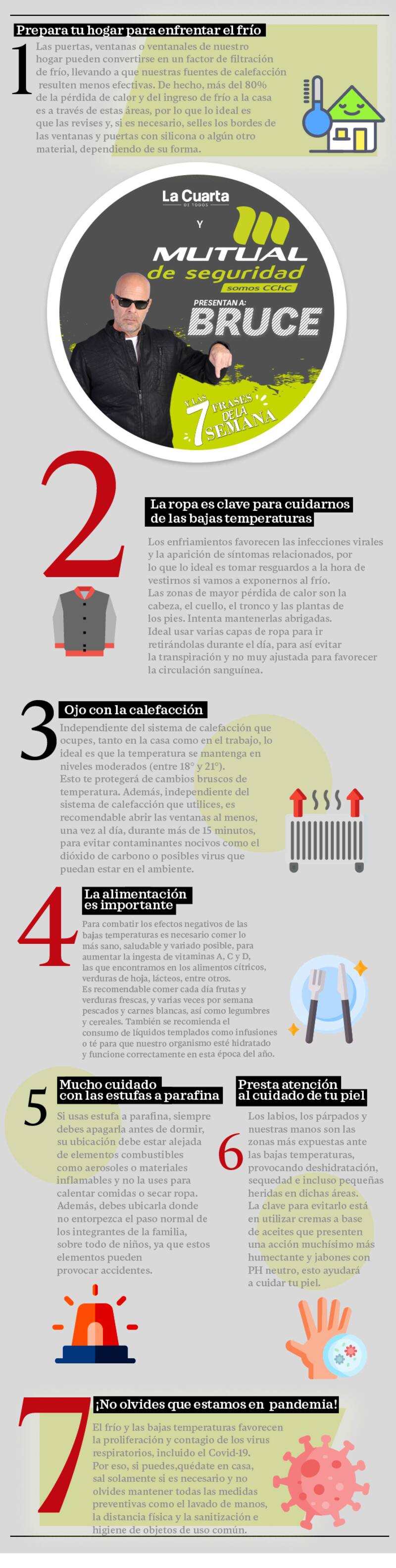 Se acerca el invierno y las bajas temperaturas se hacen cada vez más comunes, volviéndose un riesgo latente que debemos tener en cuenta, sobre todo en medio de la pandemia provocada por el Covid-19 y las enfermedades estacionales respiratorias que proliferan en esa época del año. Por eso, Mutual de Seguridad junto a La Cuarta, te comparten unas simples medidas para enfrentar el frío y evitar enfermedades, ya sea en tu trabajo o en tu hogar.