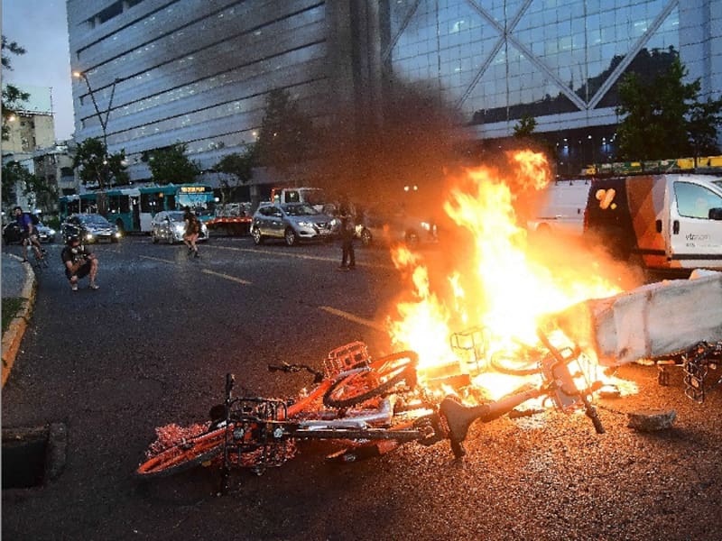 De acuerdo a lo informado por el general de Carabineros Enrique Monrás, durante los incidentes fueron quemados un vehículo policial y otros municipal, además de un bus del Transantiago y varias bicicletas públicas.