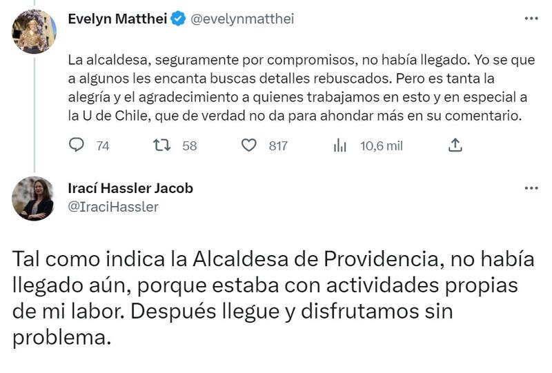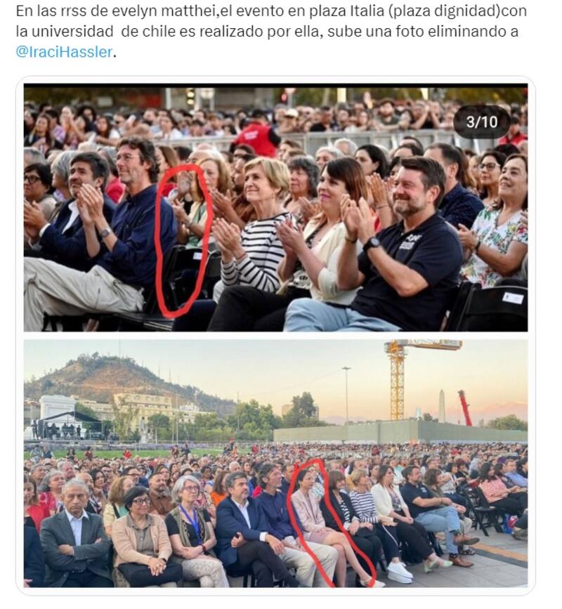“En las redes sociales de Evelyn Matthei, el evento en Plaza Italia (Plaza Dignidad) con la Universidad de Chile es realizado por ella, sube una foto eliminando a @IraciHassler”, acusó.