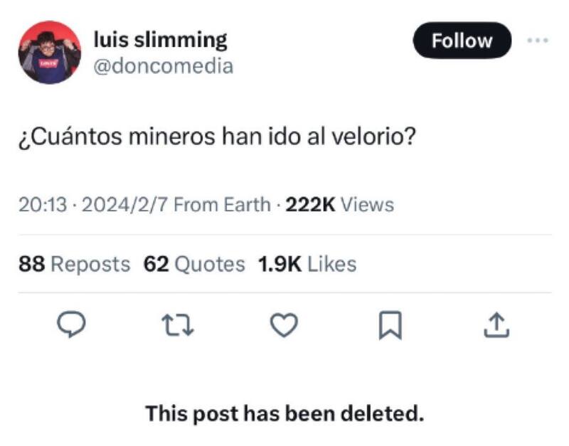 El pasado miércoles, “Don Comedia” escribió en X el siguiente mensaje: “¿Cuántos mineros han ido al velorio?”.