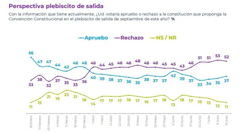 En lo que respecta al Plebiscito de salida, el Apruebo recuperó algo de terreno: subió dos puntos porcentuales y llegó a un 37%, mientras que el Rechazo experimentó una caída de un punto, quedándose en 52%.