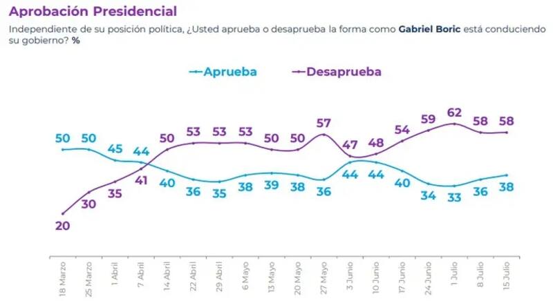 En materia presidencial, por otro lado, la aprobación de Gabriel Boric subió a un 38% —dos puntos porcentuales— y su desaprobación se mantuvo en un 58%.