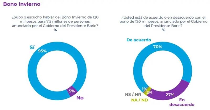 Finalmente, tras el anuncio del Bono Invierno 2022, el 70% se mostró de acuerdo con él, aunque el 82% considera insuficiente los 120 mil pesos.