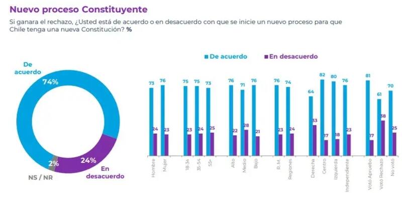 En concreto, tras las palabras que pronunció el pasado viernes el Presidente Gabriel Boric en la entrevista que concedió a Contigo en la mañana, sobre la idea de iniciar un nuevo proceso constituyente en caso de que el 4 de septiembre se imponga el Rechazo, un 74% de los encuestados estaría de acuerdo con esta opción. En contraparte, un 24% dijo mostrarse en desacuerdo.