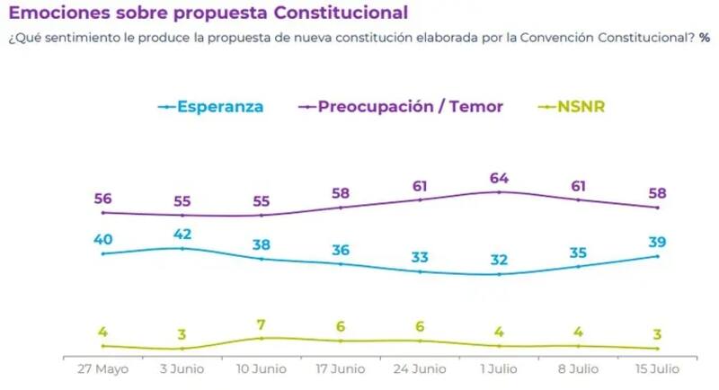 En el apartado de Emociones sobre la propuesta Constitucional, la opción de Esperanza registró un incremento de cuatro puntos porcentuales: 35% a 39%. En tanto, el Temor o la Preocupación disminuyó de 61% a 58%.