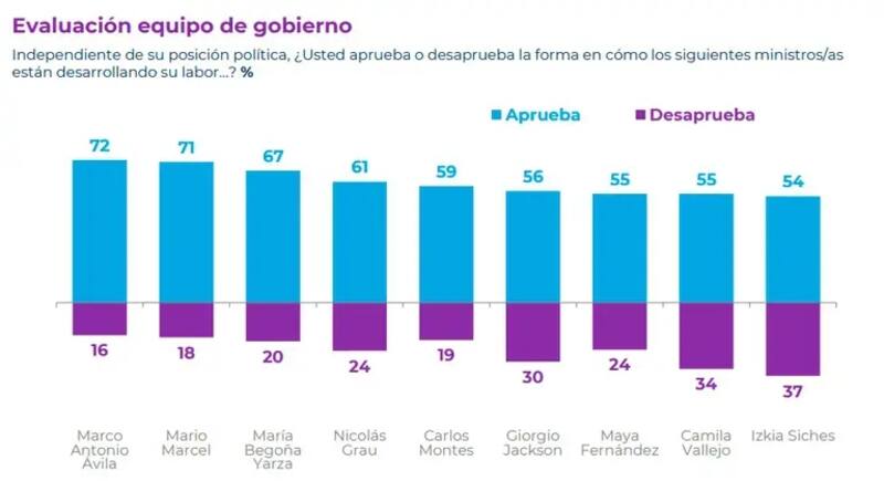 Y en cuanto al gabinete designado por Boric, apenas 9 de los 24 ministros superan el 40% de aprobación. Entre ellos, el más alto es el titular de Educación, Marco Antonio Ávila, con un 72%; seguido de cerca por el ministro de Hacienda, Mario Marcel, con un 71% y cierra el podio la jefa de la Cartera de Salud, María Begoña Yarza, con un 67%.