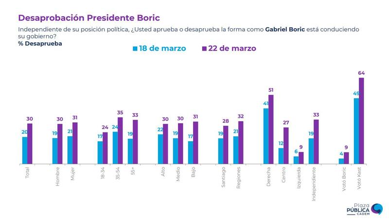 También resulta importante mencionar que la desaprobación hacia la gestión del Presidente Boric es mayor en regiones (32%) que en Santiago (28%).