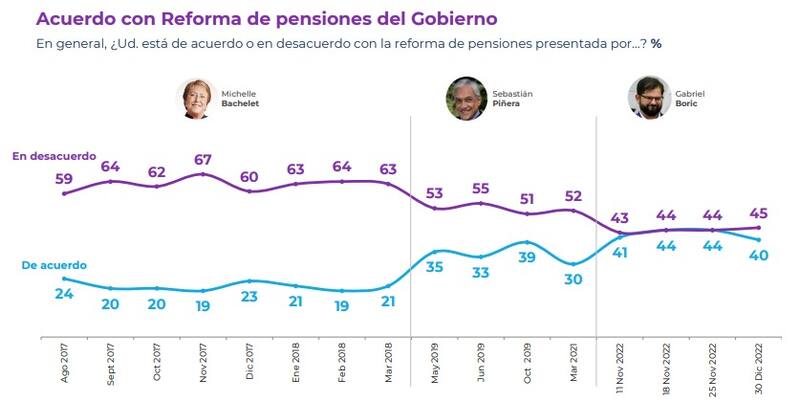 Y en lo que respecta a la reforma de pensiones, un 40% señaló estar a favor versus un 45% que está en desacuerdo.