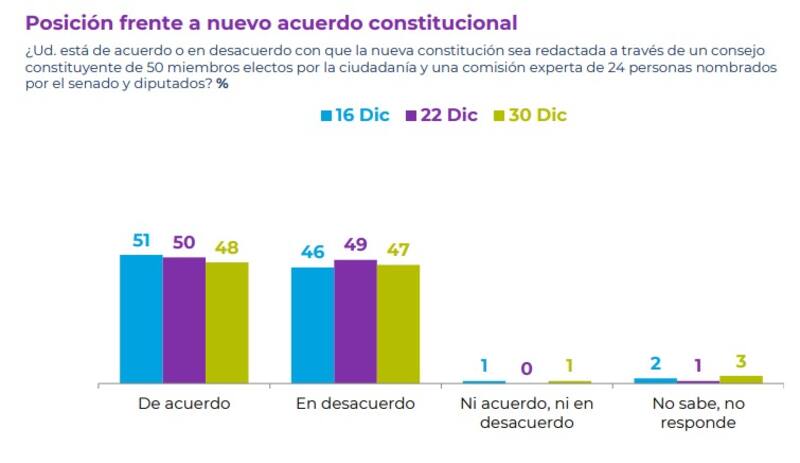 En otros ítems, un 48% de los encuestados se mostró a favor de que la nueva Constitución se redacte mediante un consejo constituyente y una comisión experta nombrada por el Senado y la Cámara de Diputados.