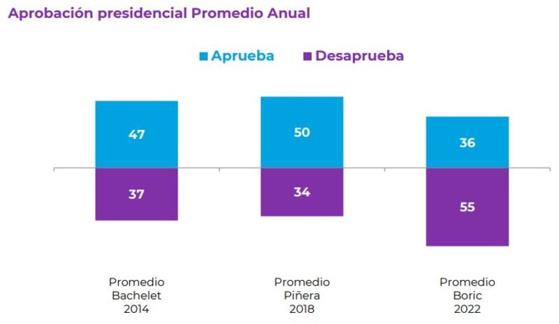 En concreto, catorce puntos por debajo del exPresidente Sebastián Piñera, que en 2018 consiguió un 50% de aprobación, y once menos que la exmandataria Michelle Bachelet, que se quedó con un 47% cuatro años antes.