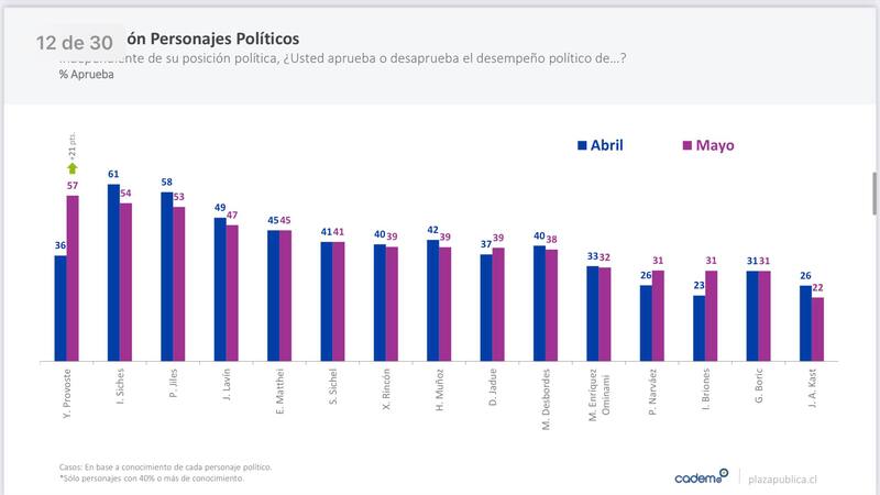 Así, la senadora pasó de tener 36 puntos en abril a tener 57 en mayo. Subió 21 puntos, superando a Izkia Siches, que bajó a 54 y Pamela Jiles, que quedó en 53.