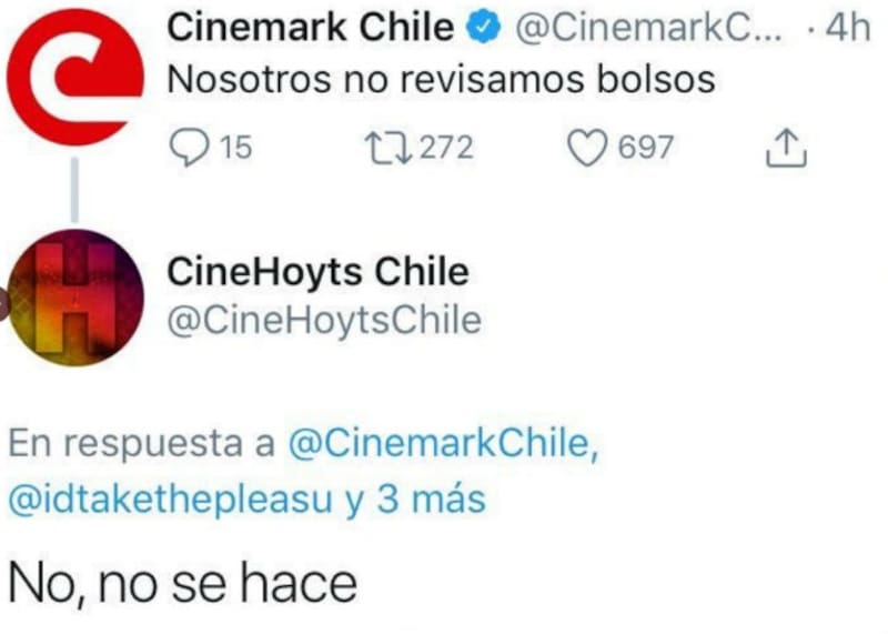 Para sorpresa del edil, distintas cadenas de cine respondieron a la información. Cinemark, Cine Hoyts y Cineplanet descartaron su afirmación. "Nosotros no revisamos bolsos", "No. No se hace" y "no revisamos las mochilas", fueron las respectivas respuestas.