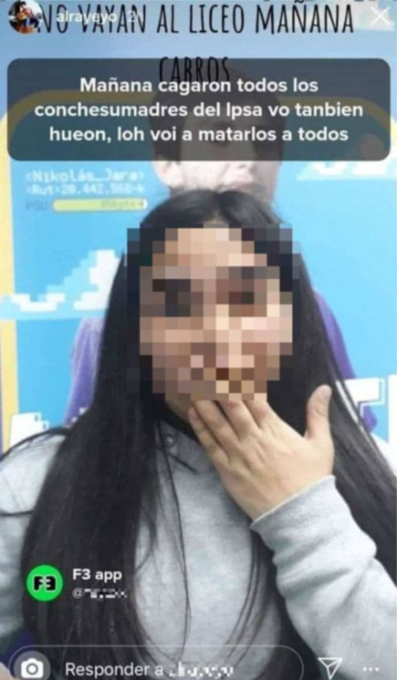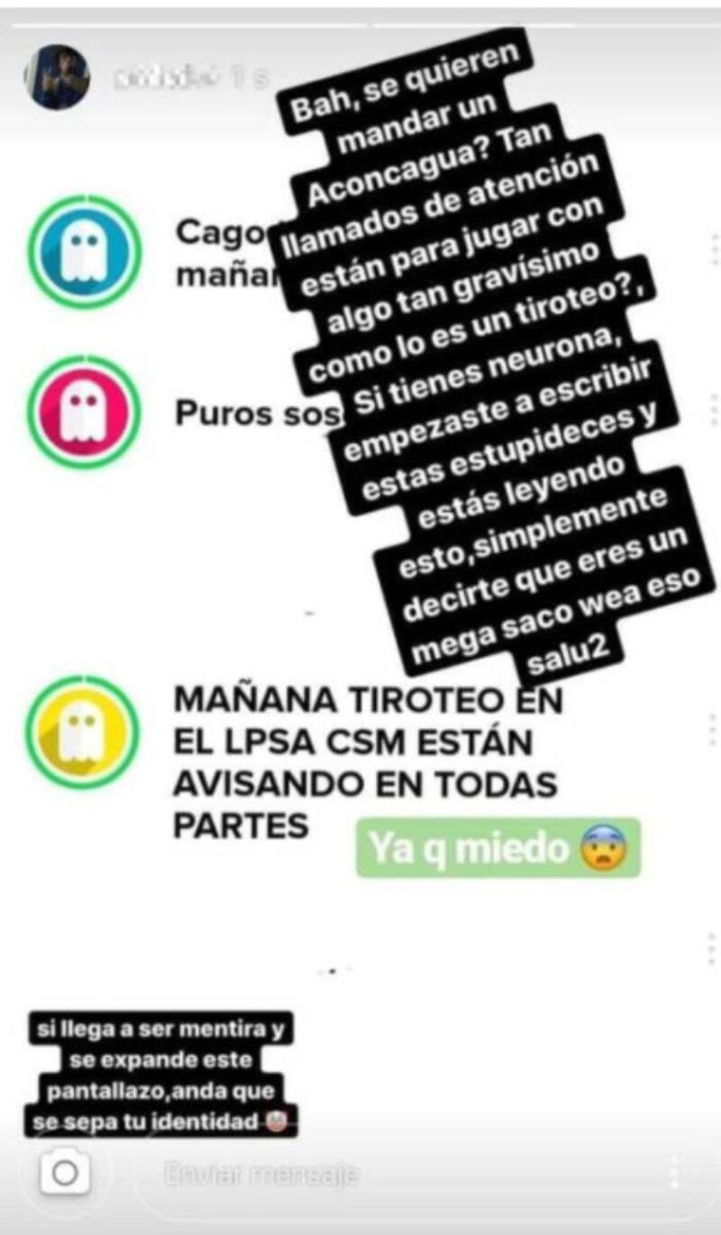 "No vayan al liceo mañana cabros". "Cagó todo el San Antonio mañana". "Mañana tiroteo en el LPSA CSM están avisando en todas partes". Fueron algunos de los textos que compartió un usuario en su cuenta de Instagram.