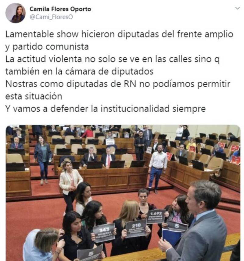 "La actitud violenta no solo se ve en las calles sino que también en la cámara de diputados. Nosotras como diputadas de RN no podíamos permitir esta situación Y vamos a defender la institucionalidad siempre", agregó.