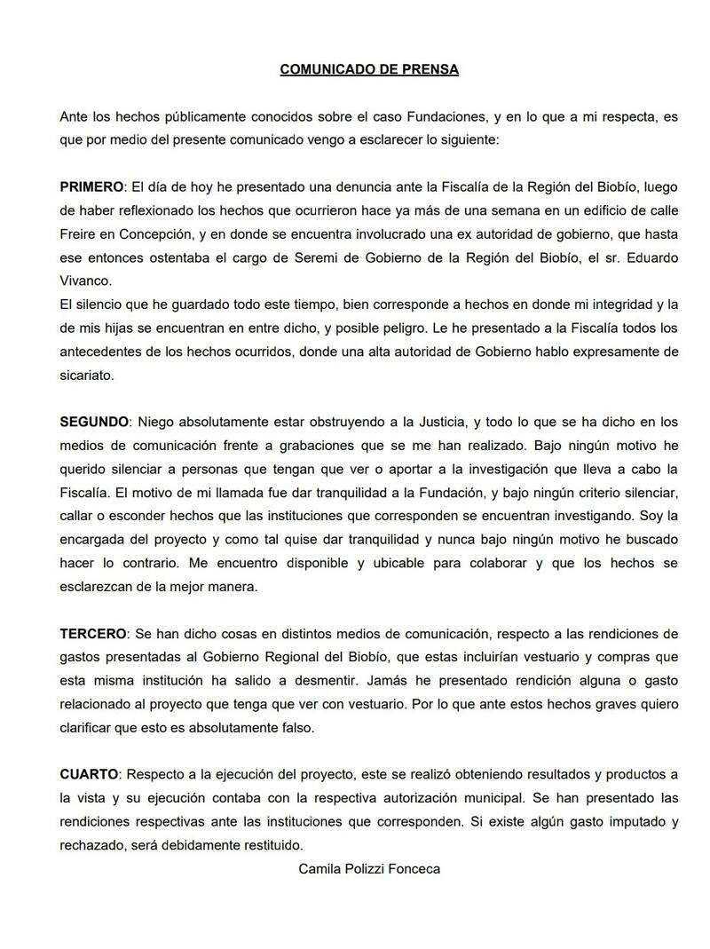 Polizzi dijo haber presentado una denuncia ante la Fiscalía, “luego de haber reflexionado los hechos que ocurrieron hace ya más de una semana en un edificio de calle Freire en Concepción”. Esto en relación a la reunión secreta que sostuvo con el entonces seremi de Gobierno, Eduardo Vivanco, quien renunció al cargo al revelarse esta cita.