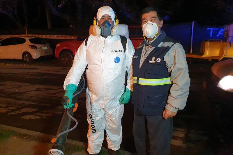 - ¿Y después? Logramos contacto con empresas Arauco que nos dijo que fuéramos cambiando de líquido para que viéramos un efecto más potente, así que iniciamos con cloro al 5%, posteriormente con amonio cuaternario y todos los días lunes con empresas Arauco y un grupo de 27 personas sanitizamos la ciudad completa.