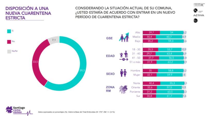 No obstante, la mayoría asegura que apechugaría con otro encierro si la cosa se vuelve a poner oscura. Así, un 59,3% de los encuestados dijo que aceptaría una nueva cuarentena estricta en caso de que sea imperioso. Mientras, un 33,5% se mostró contrario a retomar esa medida.