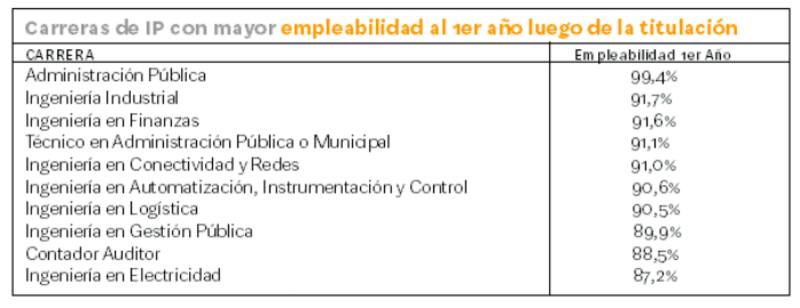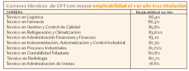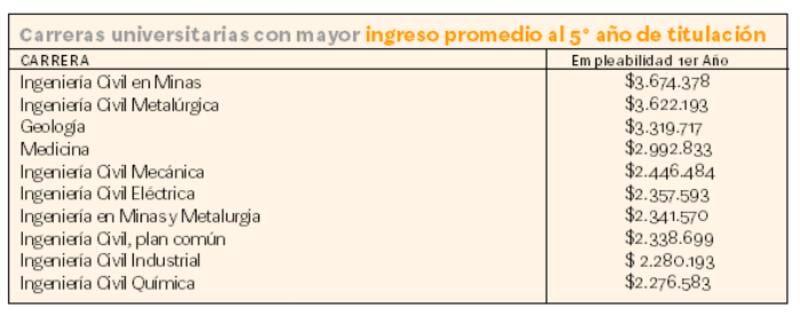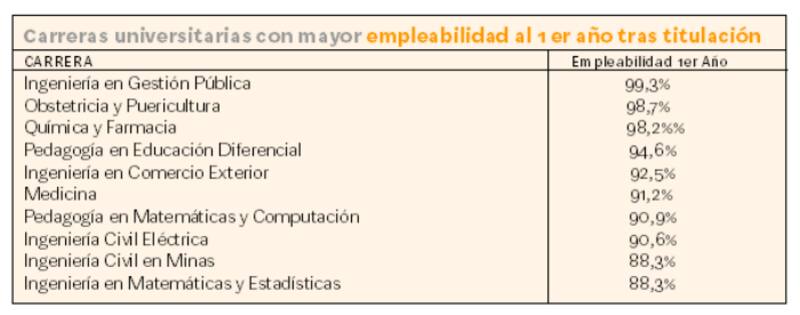 Nos encontramos con que las carreras relacionadas con la minería mantienen el liderazgo en cuanto a lucas. También las siguen las industriales. (ver tablas). En empleabilidad lideran las relacionadas con la administración pública, la logística y las farmacias.
