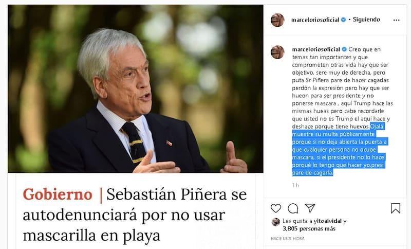"Creo que en temas tan importantes y que comprometen otras vidas hay que ser objetivo, seré muy de derecha, pero puta Sr Piñera pare de hacer cagadas. Perdón la expresión, pero hay que ser hu... para ser presidente y no ponerse máscara", indicó el ex número 1 del mundo en Instagram.