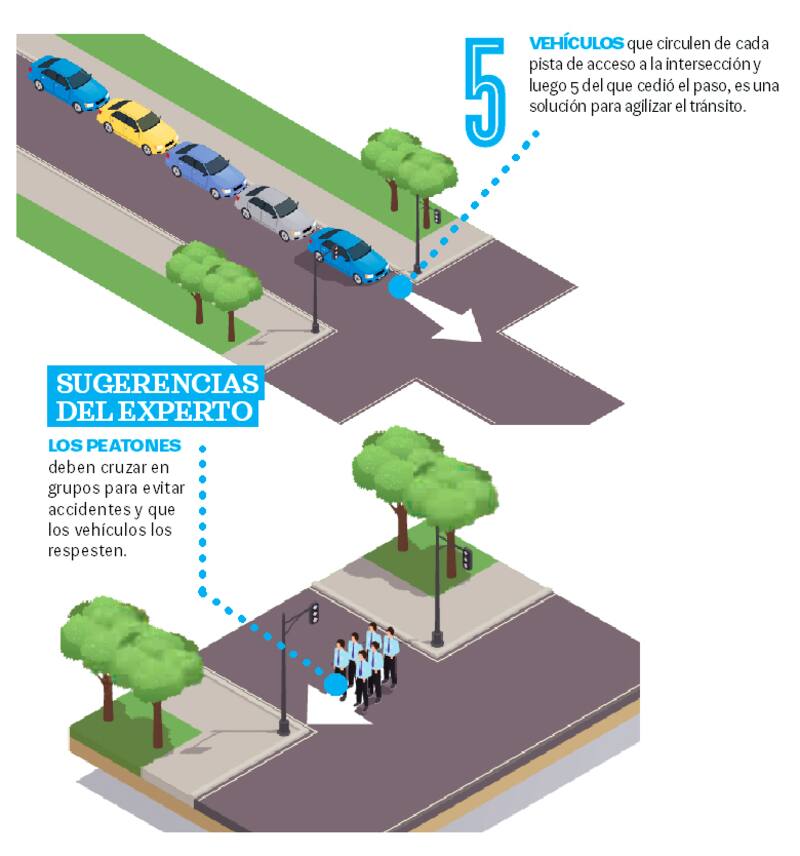 Ante este problema, y mientras no se instalen nuevos semáforos o reparen los dañados, el especialista recomienda que circulen los primeros cinco vehículos de cada pista de acceso a la intersección y luego pasen igual cantidad de automóviles por la pista de aquella rama que cedió el paso (ver infografía).