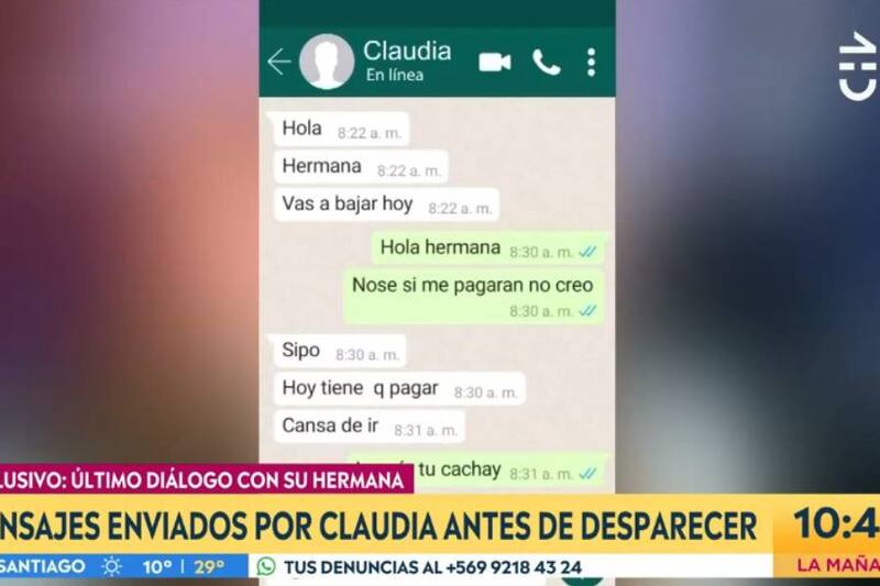 A las 8:22 horas del lunes 2 de diciembre pasado, Claudia Agüero inició una conversación vía WhatsApp con su hermana Viviana. En ese momento, la mujer se trasladaba a bordo de una micro que la llevaría hasta su lugar de trabajo. La charla telefónica se prolongó durante 23 minutos. Se trata de sus últimos mensajes antes de desaparecer.