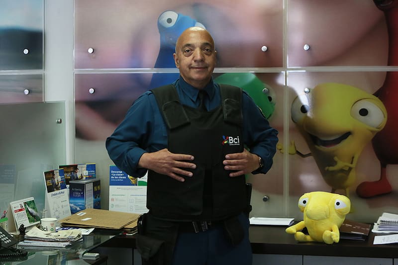 Como salido del comercial, solo que menos amarillo que el más chico de los personajes publicitarios del Banco BCI, Alejandro Maregatti (65) pone toda su atención y amabilidad como guardia en la entidad financiera.