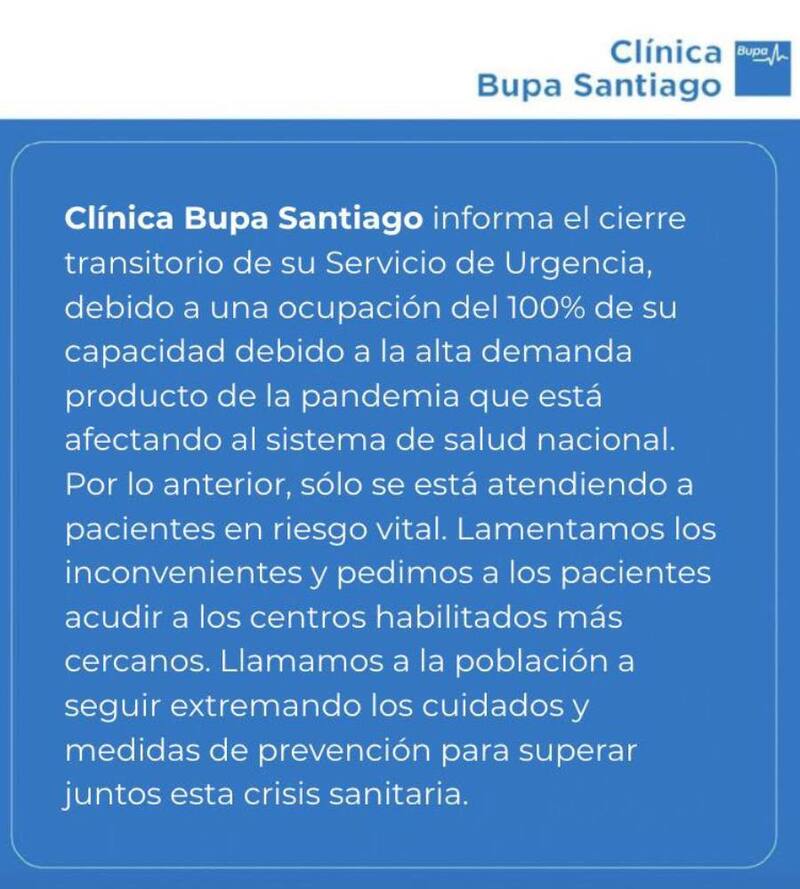 La Clínica Bupa Santiago informó del cierre transitorio de su servicio de Urgencia. Esto, debido a una ocupación del 100% de su capacidad.