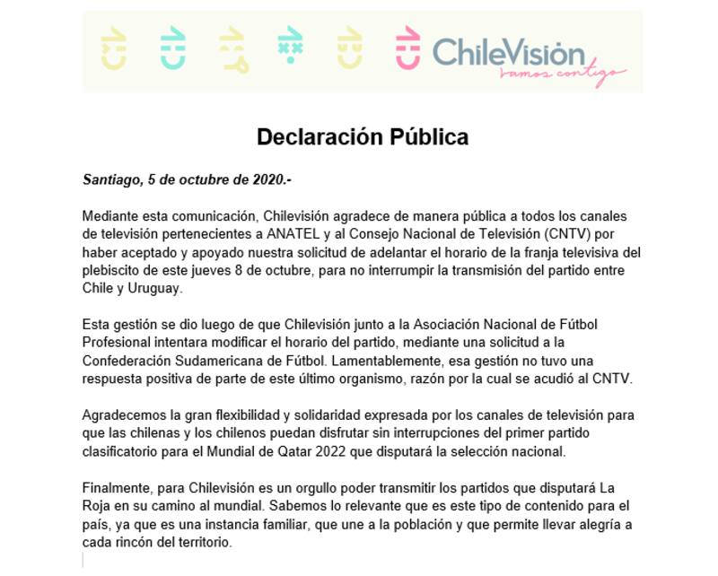 Donde sí la hubo fue en el Consejo Nacional de Televisión (CNTV), quienes junto con la aprobación de los canales asociado a ANATEL, acordaron adelantar la franja para que así no sea interrumpida por el partido.