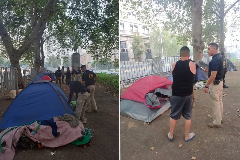Funcionarios del Departamento de Policía Internacional llegaron la mañana de este martes a revisar las carpas instaladas en el eje central de la Avenida O’Higgins, entre calles Banderas y Cumming, y también el bandejón de calle General Velásquez con la Alameda.