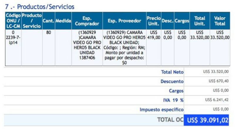 De acuerdo a información de Mercado Público, en junio de 2018, Carabineros de Chile recibió la compra de 80 cámaras GoPro a cambio de US$39.091, un poco más de $26 millones.