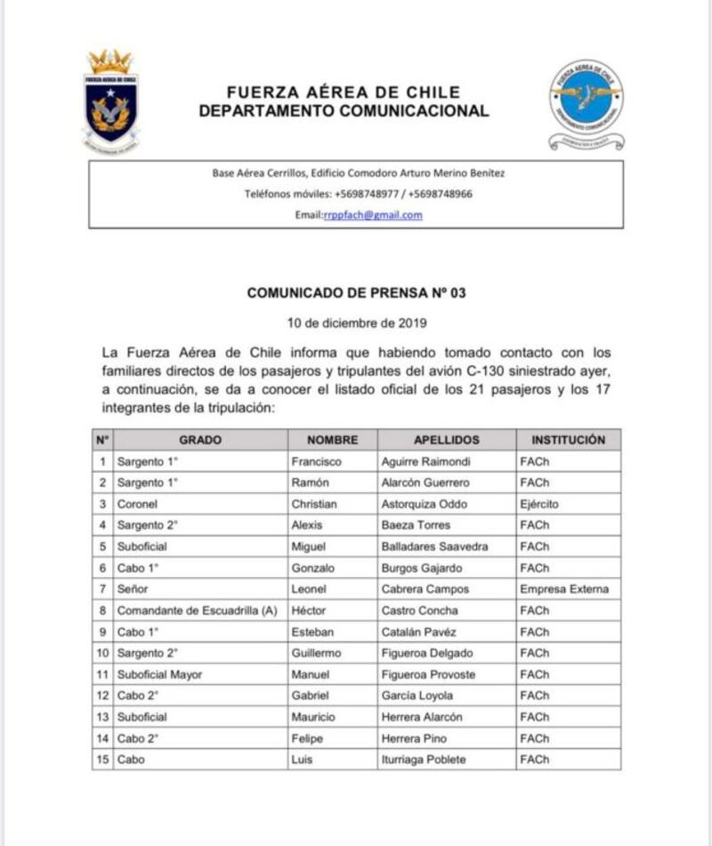 Tras esto, la FACH dio a conocer el listado de las personas que abordaban la aeronave en dirección a la Antártica.