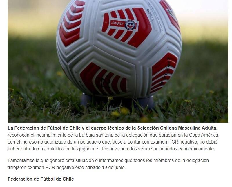 "La Federación de Fútbol de Chile y el cuerpo técnico de la Selección Chilena Masculina Adulta, reconocen el incumplimiento de la burbuja sanitaria de la delegación que participa en la Copa América, con el ingreso no autorizado de un peluquero que, pese a contar con examen PCR negativo, no debió haber entrado en contacto con los jugadores", detallaron.