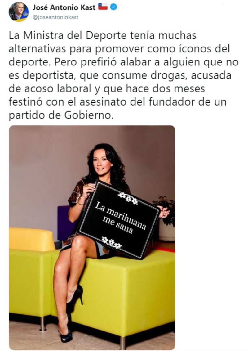 "La Ministra del Deporte tenía muchas alternativas para promover como íconos del deporte. Pero prefirió alabar a alguien que no es deportista, que consume drogas, acusada de acoso laboral y que hace dos meses festinó con el asesinato del fundador de un partido de Gobierno".