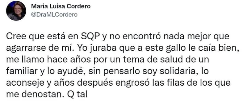 En otro tuit, la doctora repasó a Naranjo: "Cree que está en SQP y no encontró nada mejor que agarrarse de mí. Yo juraba que a este gallo le caía bien, me llamo hace años por un tema de salud de un familiar y lo ayudé, sin pensarlo soy solidaria, lo aconsejé y años después engrosó las filas de los que me denostan".