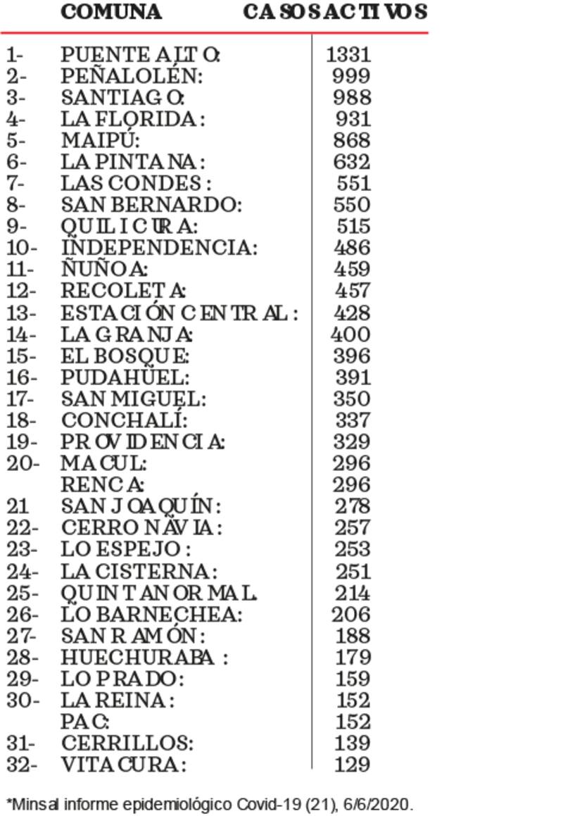 Comunas. Tomando en cuenta el último informe epidemiológico (N°23) entregado por el Minsal, La Cuarta elaboró un mapa de los casos activos por comuna del Santiago urbano (34 comunas). ¿Cuáles son los casos activos? Son las personas (vivas) confirmadas con Covid-19, cuya fecha de inicio de síntomas en la notificación, es menor o igual a 14 días a la fecha del reporte actual.