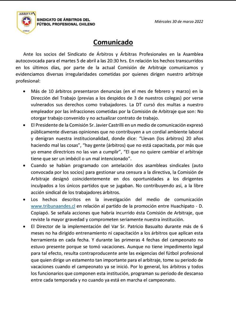 Por otro lado, el sindicato establece que el Director de Implementación del VAR, Patricio Basualto “durante más de seis meses no ha dirigido entrenamiento ni capacitación a los árbitros que aplican esta herramienta en cada fecha. Durante las primeras cuatro fechas del Campeonato no estuvo presente, porque se tomó vacaciones. Resulta contraproducente ante las exigencias del fútbol profesional que quien dirige este estamento tan importante para el arbitraje tome su período de vacaciones cuando el campeonato ya se inició”.