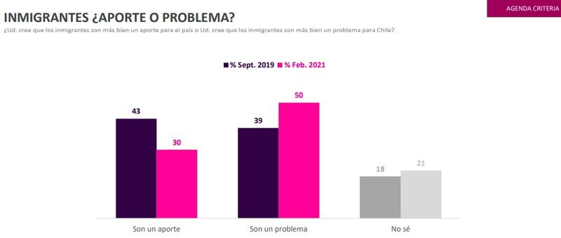 Respecto al ítem "Inmigrantes: ¿aporte o problema?", un 50% se inclinó por que éstos "son un problema", un 11% más versus los resultados de 2019.