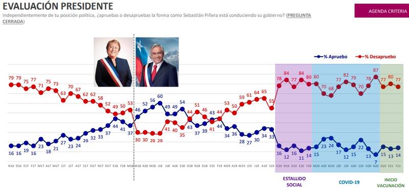 Apenas un 14% de los entrevistados dijo apoyar a Sebastián Piñera. Su desaprobación, de hecho, llegó al 77%, mismo resultado que en enero.