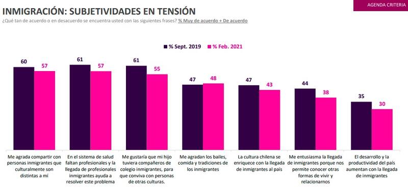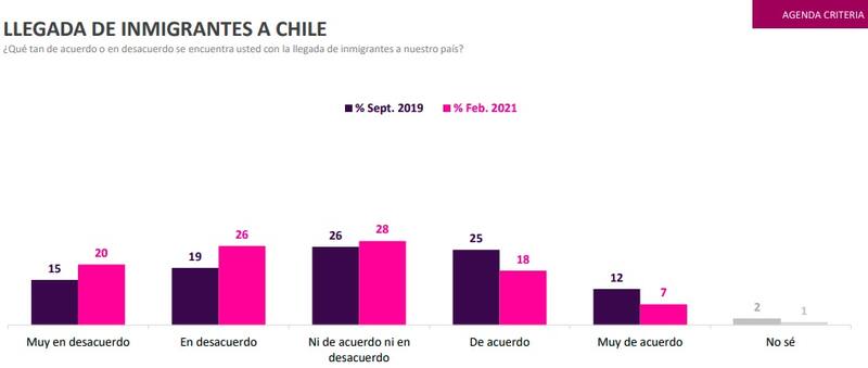 Basta comparar los datos con septiembre de 2019: un 46% afirmó estar en desacuerdo con la llegada de extranjeros a Chile (+13%). Asimismo, tan solo un 25% se mostró de acuerdo con la migración (-12%).