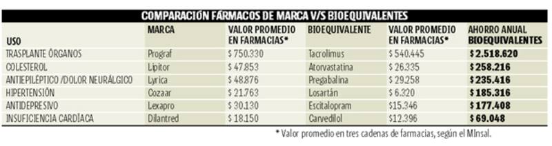 Según, la investigación, en el caso de una droga inmunosupresora, que requieren de por vida las personas con trasplante de órgano, si opta por el bioequivalente (Tacrolimus) que tiene un valor de $540.445 por caja, por sobre el de marca (Prograf ) que alcanza un valor de $750.330 por caja, se podrá ahorrar 2 millones 518 mil pesos anuales.