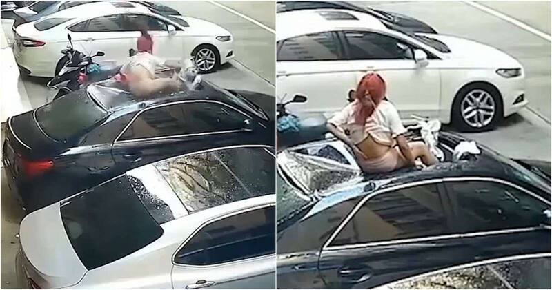 Dale más gasolina: pelirroja aterriza semidesnuda sobre el techo de un auto mientras se cacheteaba de lo lindo en el balcón