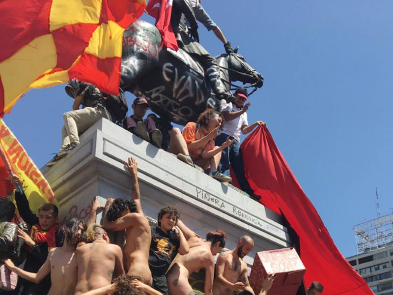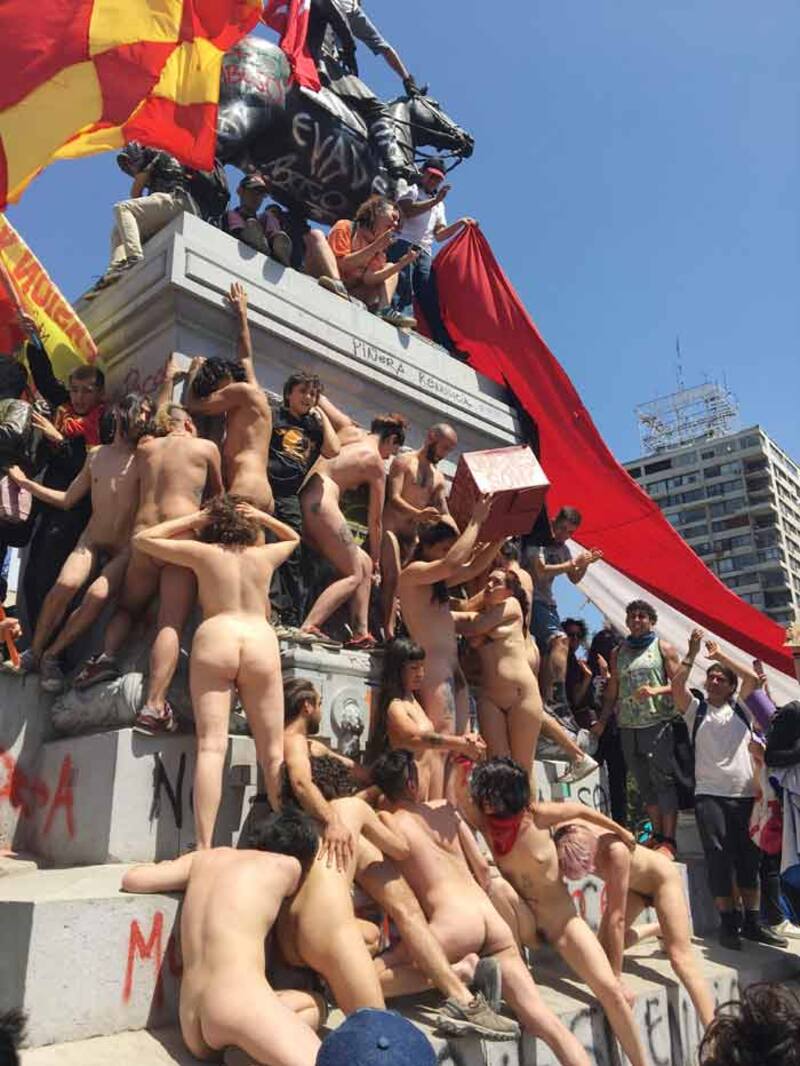 Eran cerca de las 2 de la tarde y el cara de gallo estaba en su máximo esplendor en el centro de Santiago, con la temperatura subiendo a los 26°, y mientras algunos aplaudían o le daban duro a la cacerola a la espera de que iniciara la gran convocatoria, entre la multitud un grupo de hombres y mujeres, absolutamente desnudos, hizo su aparición sorprendiendo a los manifestantes.